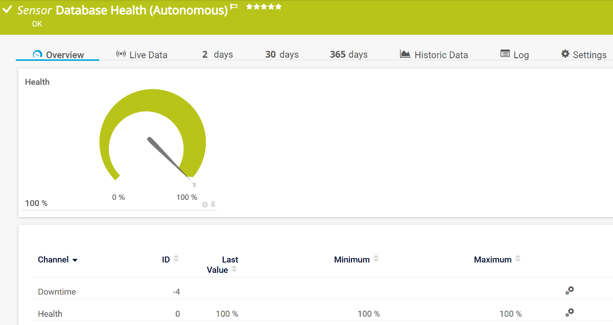 The Database Health (Autonomous) sensor monitors the health of the PRTG Database server.