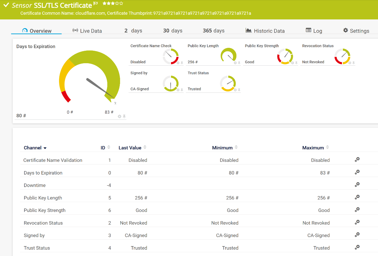 The SSL/TLS Certificate sensor monitors the certificate of a connection secured by Secure Sockets Layer (SSL)/Transport Layer Security (TLS).